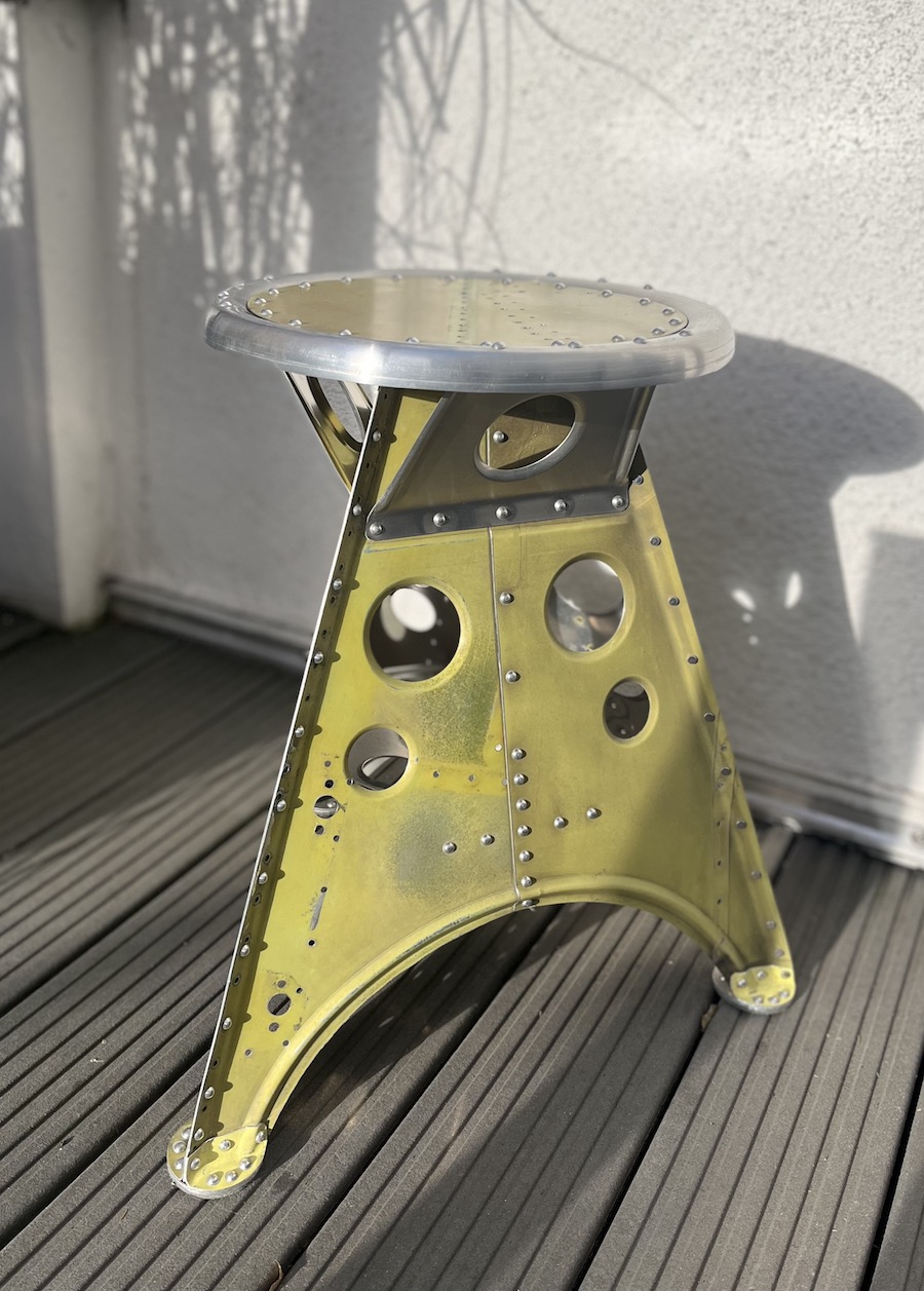 Das Projekt Aero 1946 kombiniert die Handwerksarbeit nach dem klassischen Flugzeugbau der 1940er Jahre mit dem Prinzip des Upcyclings. Das Material stammt in der Regel von Heckauslegern, Finne oder Elevatoren alter BELL-Hubschrauber. Die ultraleichten Hocker sind stylische Unikate und sehr belastbar.