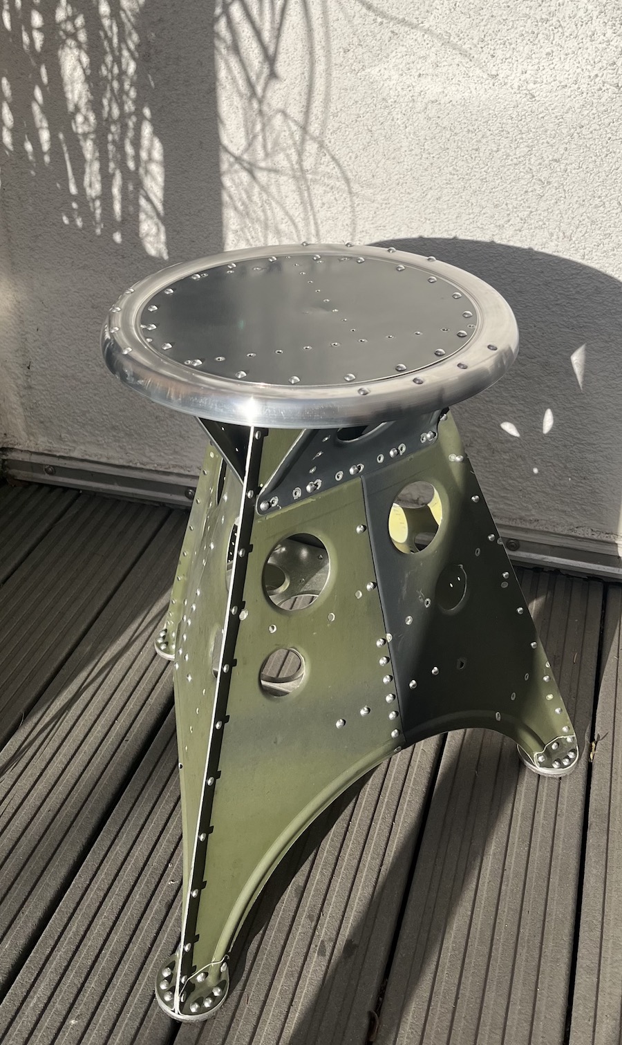 Das Projekt Aero 1946 kombiniert die Handwerksarbeit nach dem klassischen Flugzeugbau der 1940er Jahre mit dem Prinzip des Upcyclings. Das Material stammt in der Regel von Heckauslegern, Finne oder Elevatoren alter BELL-Hubschrauber. Die ultraleichten Hocker sind stylische Unikate und sehr belastbar.