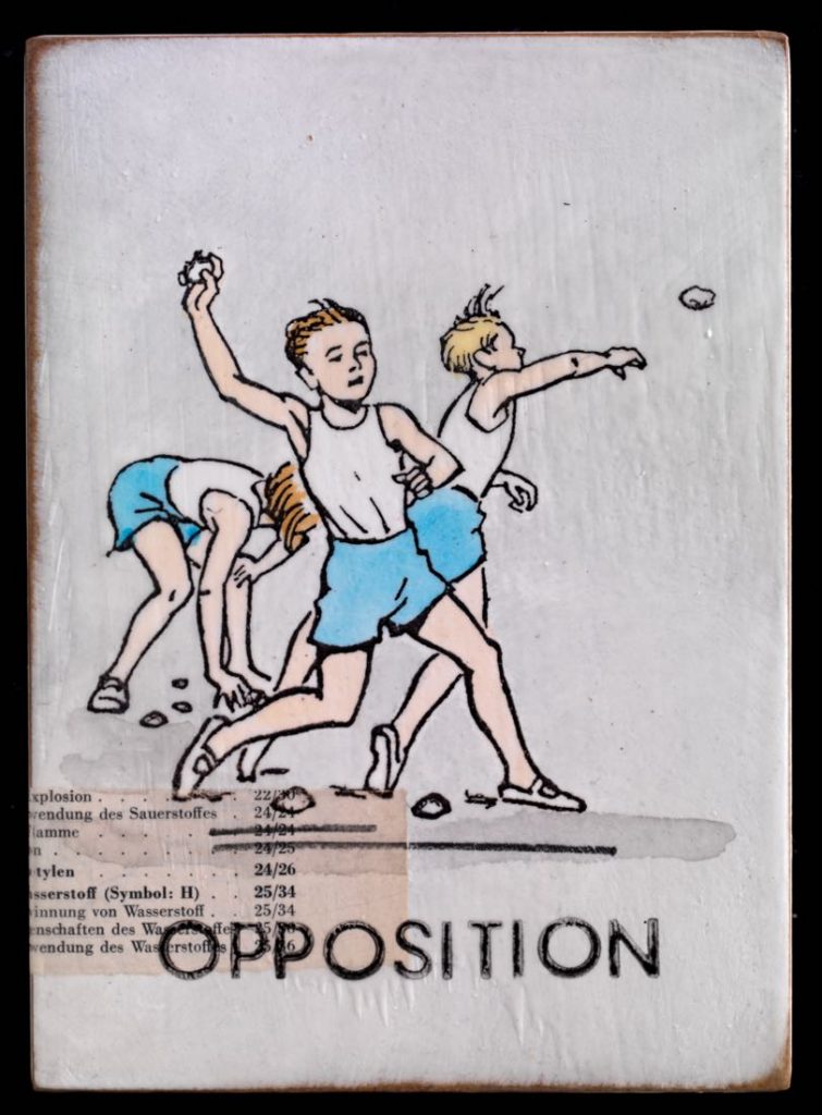Kunst für Alle, Provokation, Denkhilfen, Witz und Ironie. Alle diese Begriffe können das Wandobjekt „opposition“ definieren. Den Künstler Jan M. Petersen arbeitet hier mit Acryl und Wachs auf Holz.