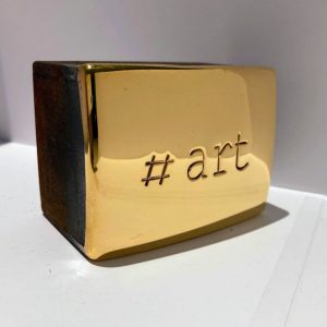 Kunst für Alle, Provokation, Denkhilfen, Witz und Ironie. Alle diese Begriffe konnen die Wandobjekt „# art “ definieren. Den Künstler Jan M. Petersen arbeitet hier mit Cortenstahl und Bronze vergoldet.